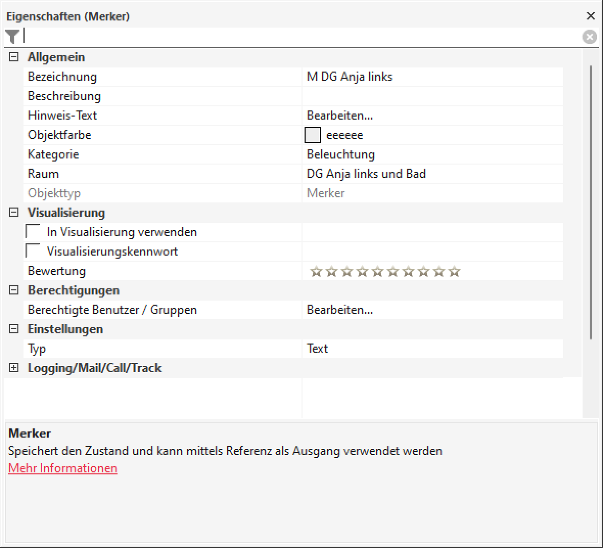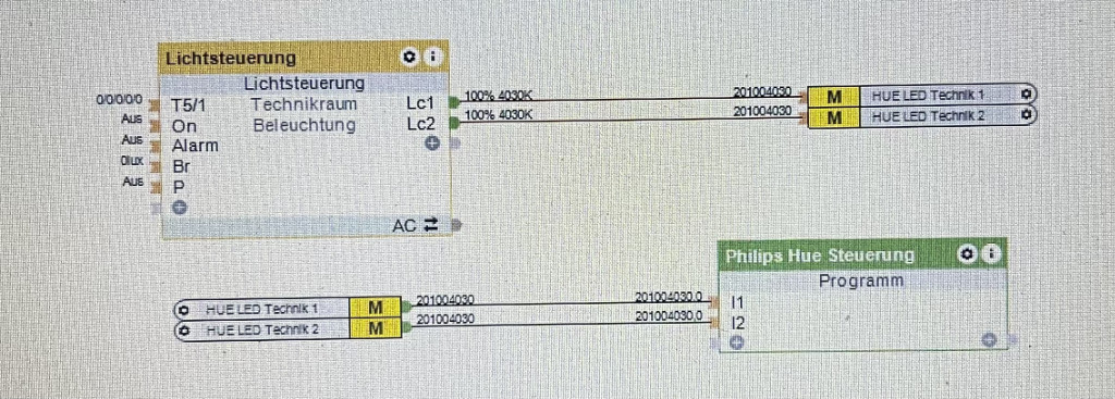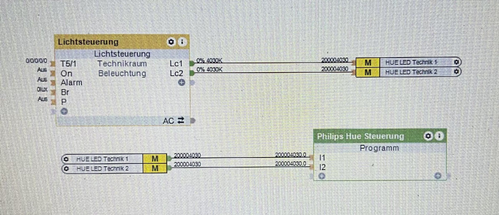 Beispiel Ceiling Lights: Bei diesem Lichtsteuerungsbaustein habe ich die beiden Merker für die Lampen auf einen Ausgang gelegt und im Progammbaustein, den Lampentyp 2 mal auf I1 und I2 gelegt. So schalten sie zwar miteinander.