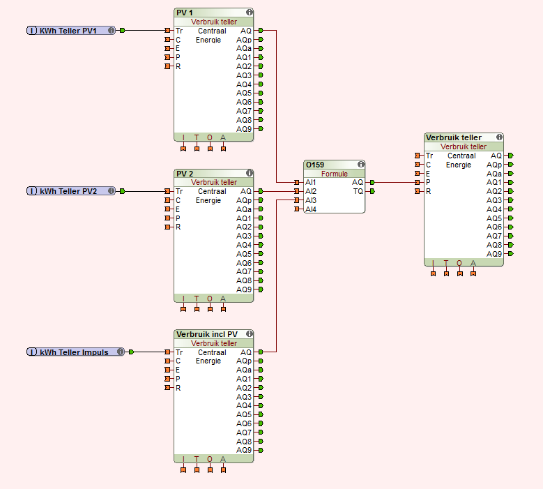 I recently started trying to visualize my power consumption in my Loxone system. I installed a 3-phase power consumption meter (VOLTCRAFT VSM-102) and hooked that up to a Utility Meter Block using the pulse output. Of course, this also measure the production of my PV installation. To solve this I used to pulse out of the "green current" meters we need to have installed here in Belgium (em10-din.av8.1.x.01.p) to two additional Utility Meter Blocks (I have two PV circuits).