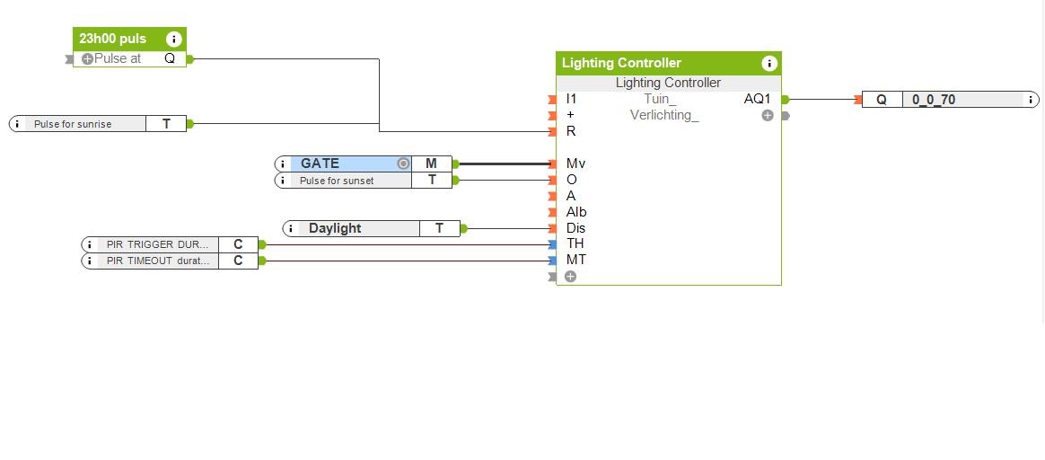 R => "puls for sunrise", and for now an "timer puls at 23h00" so the light doesn't stay on all night