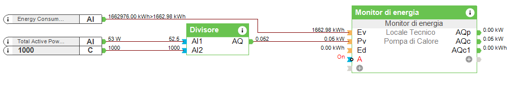 The block was programmed in Config as "block inputs" and memory size has been set to 10.000 (kWh)