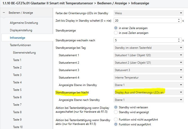 Ja, das ist alles klar. In der Nacht kannst Du über die Helligkeit den Taster komplett abschalten lassen. Das kannste auch konfigurieren. Du kannst auch einstellen, dass der Taster bei Display aus direkt in den normalen Betriebsmodus geht und nicht nur den Standby anschaltet. Das kann man sich schon ganz gut konfigurieren. Nur mein Wunsch lässt sich wohl nicht verwirklichen ;-)