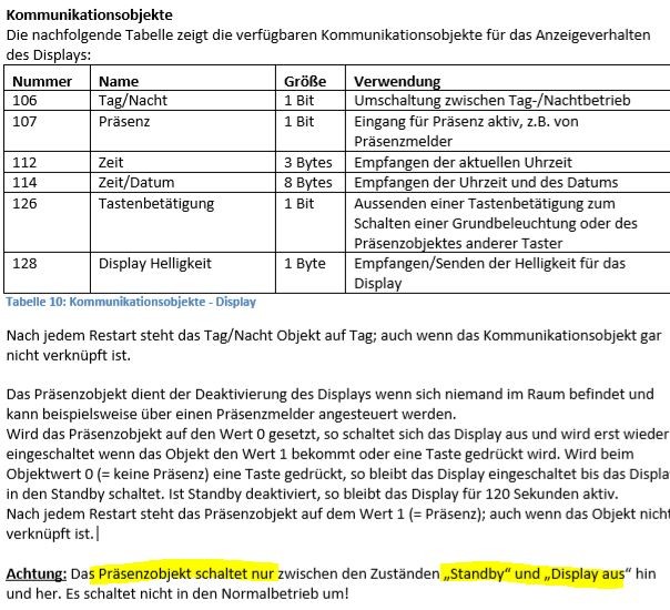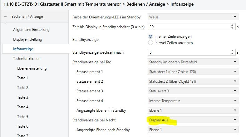 Nachtabschaltung hier habe ich das gleiche Phänomen beobachtet wie netzlaff. Wenn ich die Taster über ein KO von der Wetterstation nachts schlafen schicke, für nachts aber Display aus + Orientierungs-LED an parametriert habe, geht das Display aus UND auch die Orientierungs-LED. Die LED gehen bei erstem Tastendruck an, das Display in den Bedienmodus erst nach dem 2. Tastendruck. Da mir dieses Verhalten nicht gefiel, habe ich testweise das Anzeigeverhalten dahingehend geändert, dass ich sowohl bei Tag als auch bei Nacht niemals in den Standby gehe. Ich habe aber das Tag Nacht Objekt weiterhin mit dem Taster verknüpft gelassen. Wenn das Nachtobjekt aktiv ist, gehen die Displays trotzdem kpl. aus, also ohne Anzeige und auch die LED aus. Nun schalten die Displays aber beim ersten Tastendruck sofort in die Bedienansicht. Wenn ich das Nachtobjekt lösche, verhält sich der Taster dann so, wie ich es erwarte. Display ist immer an. Das Nachtobjekt scheint somit zumindest bei mir und auch bei netzlaff die gewählten Einstellungen zusätzlich zu überlagern, ohne dass ich dies irgendwie irgendwo einstellen kann.