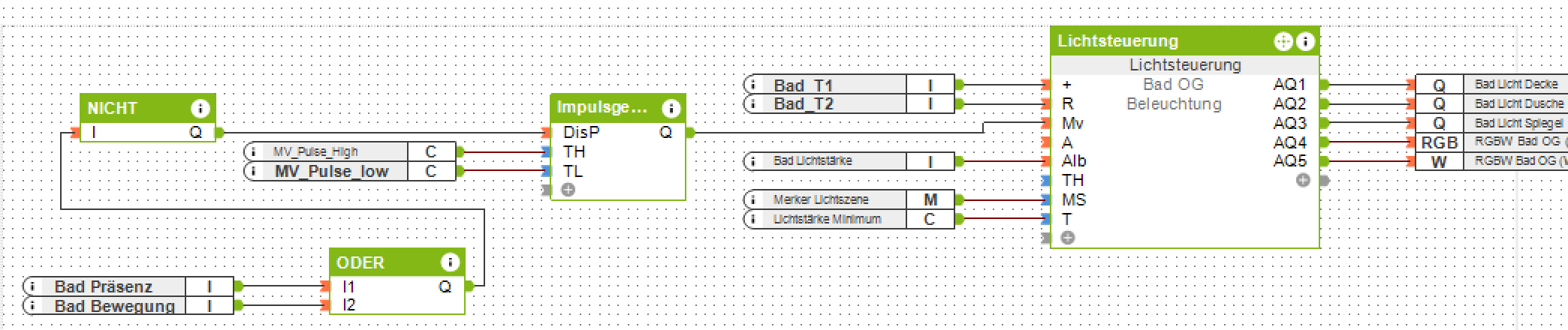 MV-Eingang des Lichtbausteins mit Präsenz-erkannt-GA des Melders verbunden.