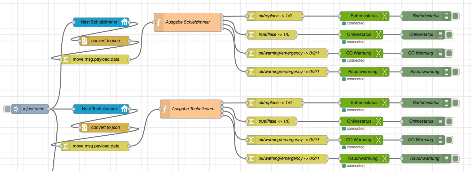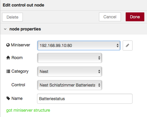 Ich hab dir Screenshots des Loxone Batteriestatus nodes (hier habe ich einen "control out node" verwendet) und des Batterie debug nodes gemacht. Der Rest sieht soweit OK aus (allerdings ohne Streaming - hier muss der inject node "Nest abrufen" auf jeden Fall 60s oder mehr eingestellt sein, ansonsten blockiert dich die Nest API sehr schnell).