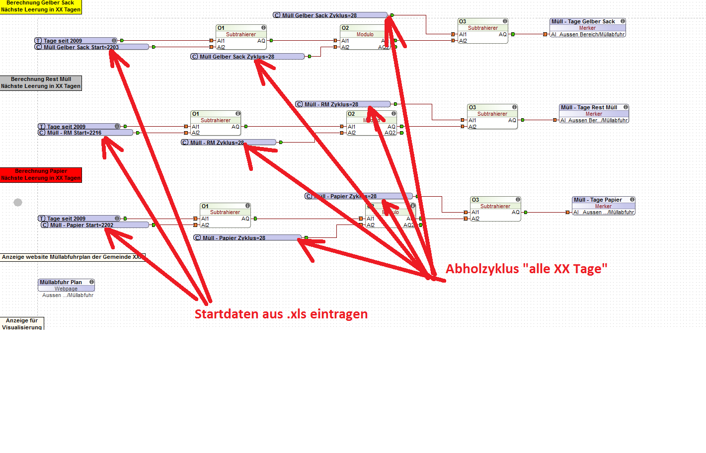 Einmal pro Jahr die erste Entleerung sowie den Abholzyklus in Tagen (etwa 13.1.2016 sowie alle 28 Tage) in die "Exceltabelle Muellabfuhr Berechnung für Loxone.xls" eintragen.