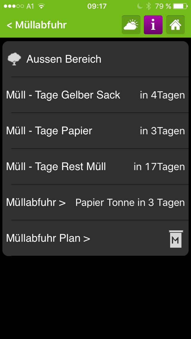 -Anzeige der restlichen Tage bis zur Entleerung von Restmüll (grau), Papier (rot) und Plastik (gelb).