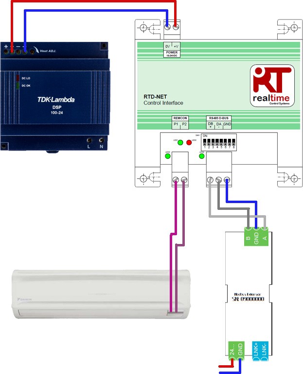 - P1/P2 am RTD-NET Modul mit P1/P2 am Klima Innenteil verbinden (geschirmtes, verdrilltes Kabel)