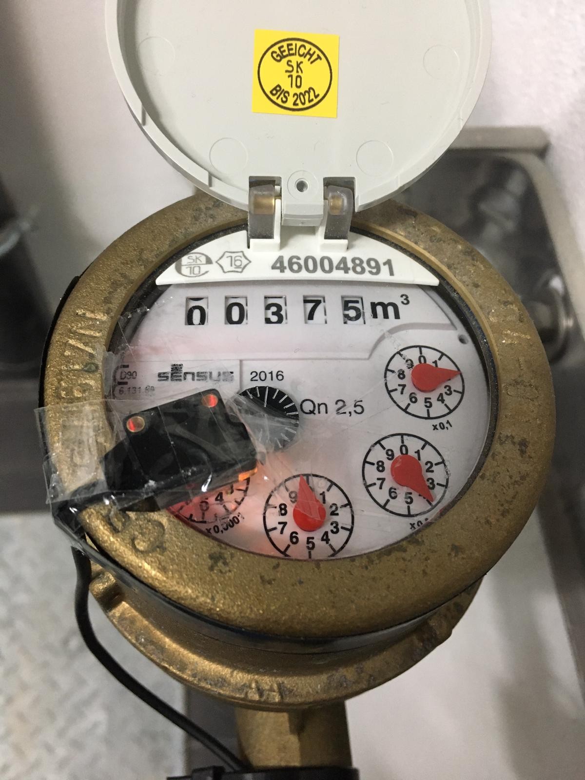 ...Nur eine Frage noch, der Sensor bekommt bei mir einen Dauerimpuls.... Durch drehen des kleinen Rad´s in der Wasseruhr wird der Impuls unterbrochen und der Verbrauchszähler