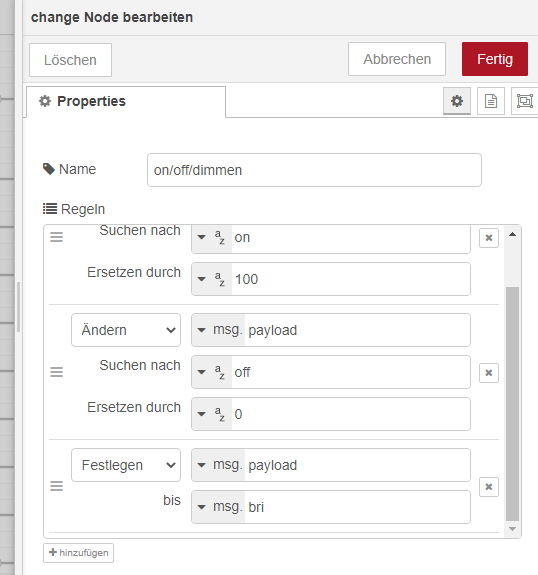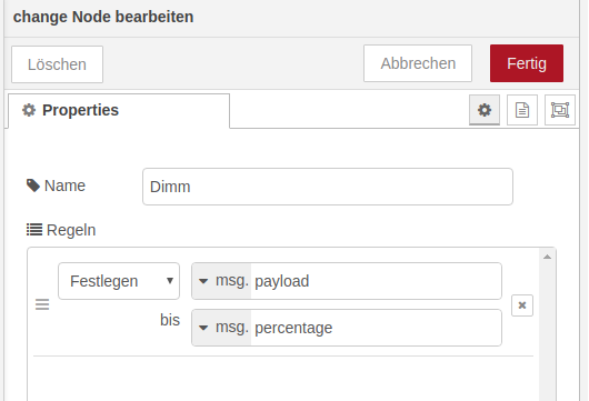 Ich nutze ein Lichtbaustein der 2.Generation und habe dahinter auf AQ1 den W-DMX-Aktor und auf AQ2 den RGB-DMX-Aktor (-> angeschlossen sind die Loxone-Originalspots RGBW). Habe bereits herausgefunden, dass ich mittels "jdev/sps/io/wohnzimmerlicht/AI1/ + 0 bis 100" das Licht in der gewünschten Stufe ansteuern kann. Aber wie müsste nun der Node-Red-Baustein vollständig aussehen, damit ich bspw. das Wohnzimmerlicht auf X % gedimmt bekomme?