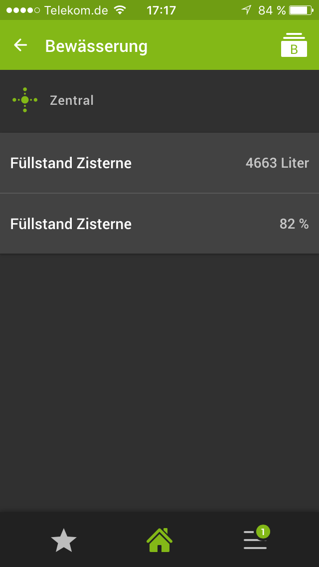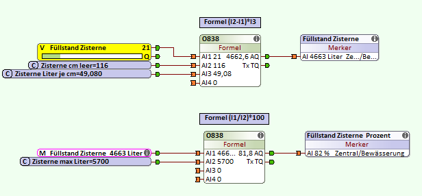 Dazu ist die Montagehöhe des Sensor nötig (Zisterne cm leer), sowie die Liter je cm (Zisterne Liter je cm).