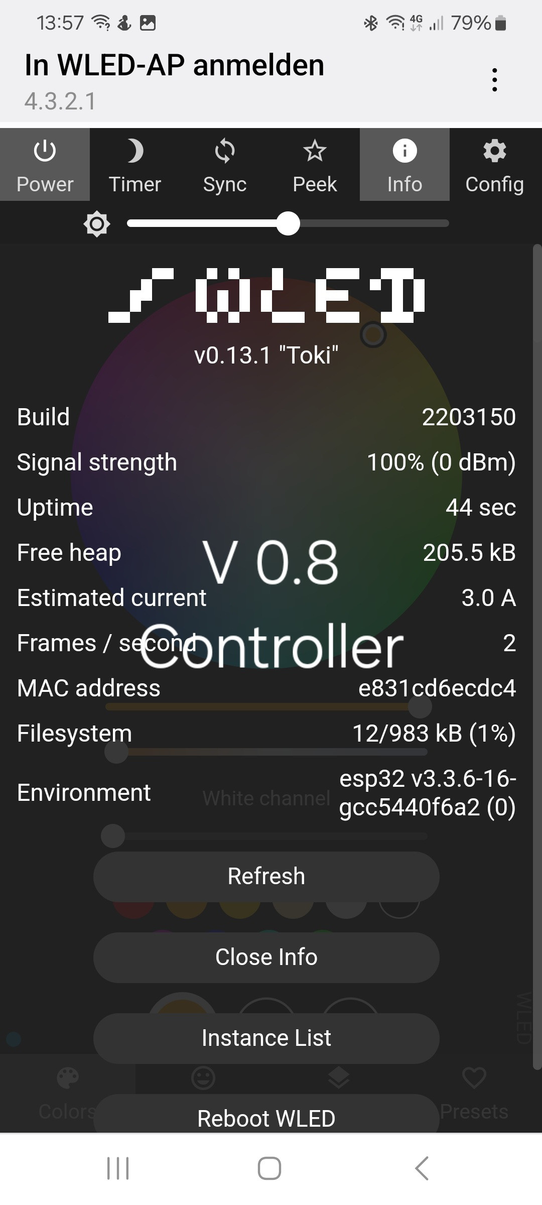 Vielen Dank fürs feedback und LG, HarryZuletzt geändert von harryair; 08.01.2025, 13:17. Grund: Nachtrag WLED Version WLED 0.15.0 ESP32 (ESP32-D0WDQ5 build 2412100) -