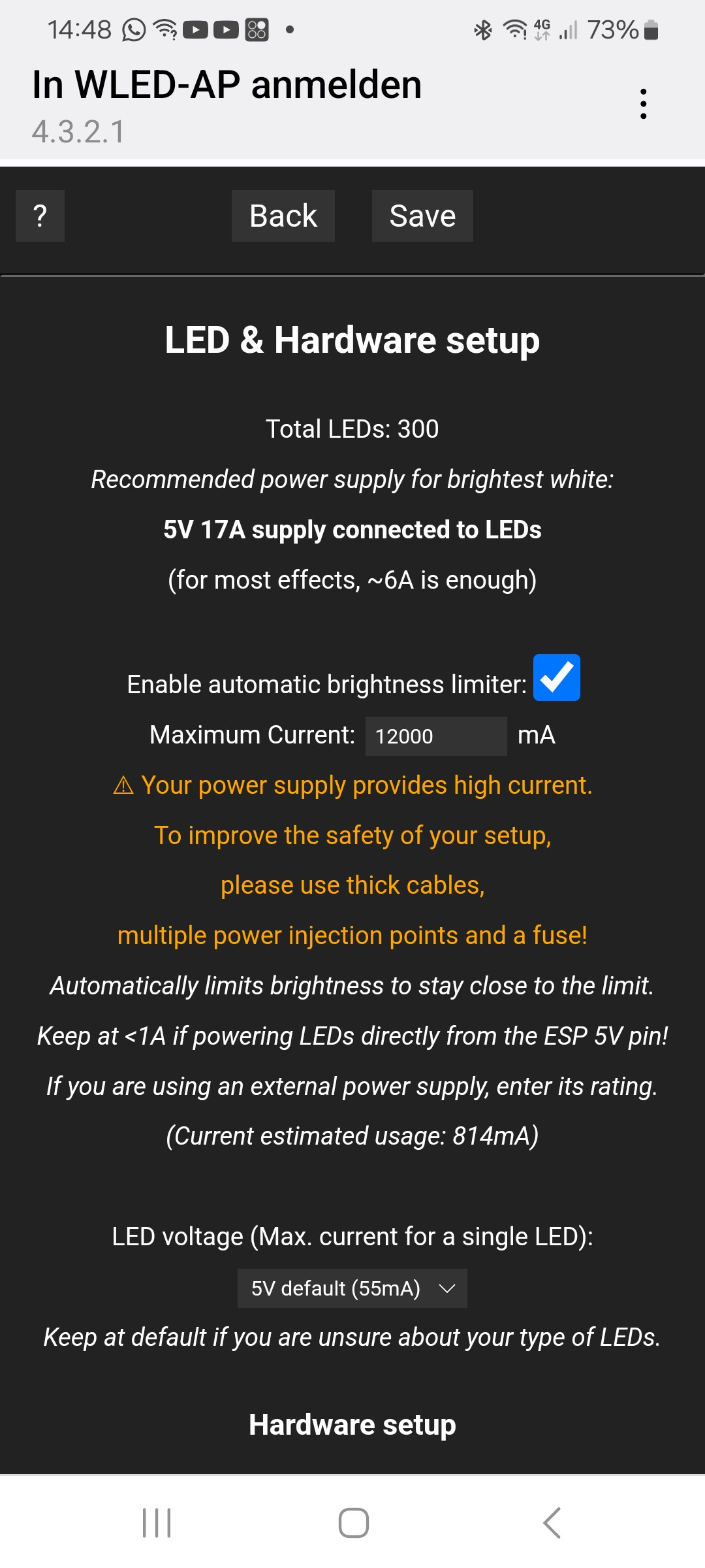 Bei den von mir verwendeten Effekten reichen mir die max. 12A des Netzteils aus, man sollte aber entsprechend auch die Stromlimitierung im WLED auf 12000mA aktivieren!