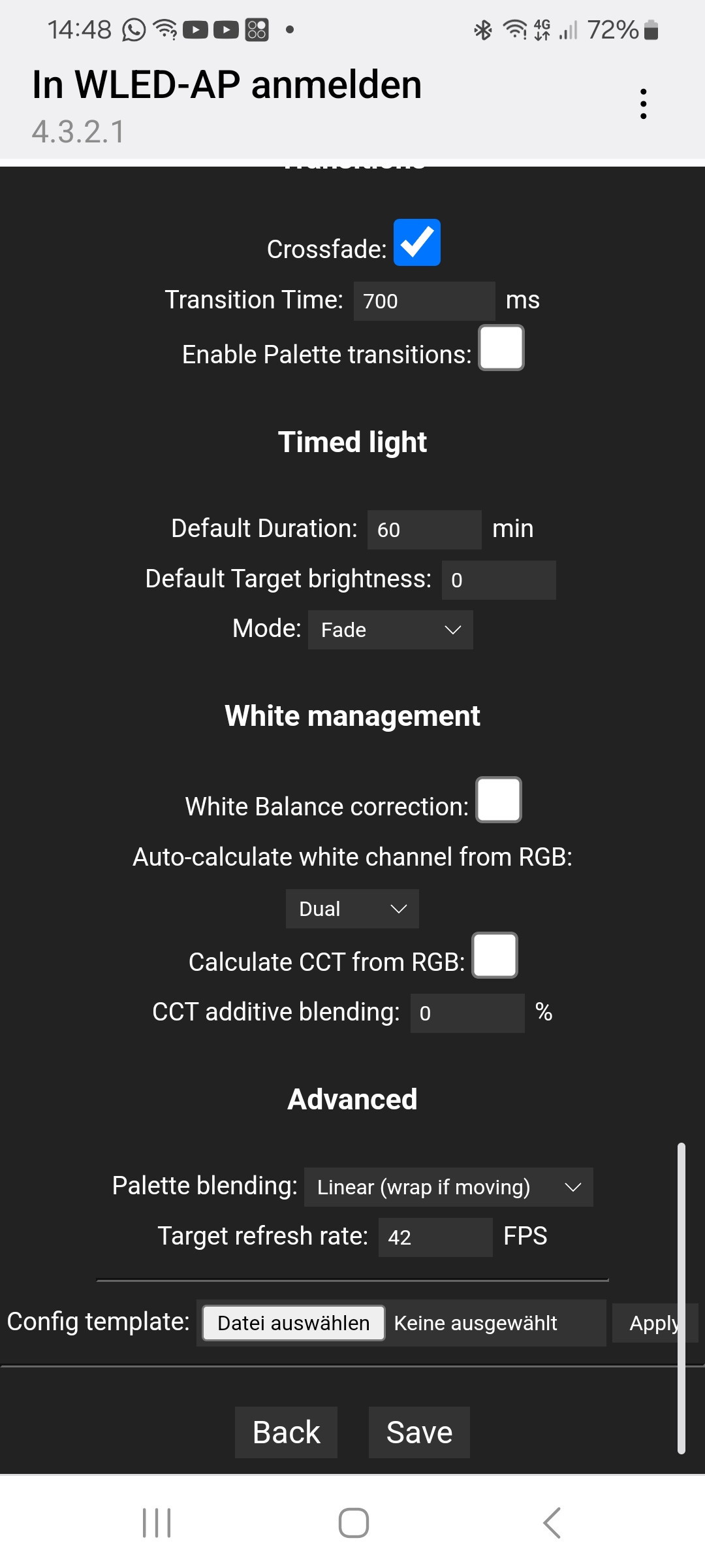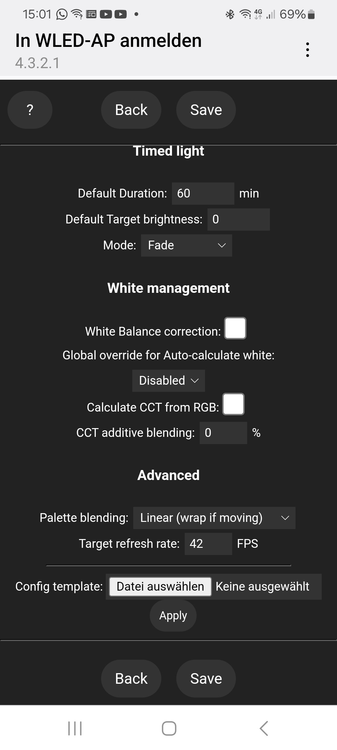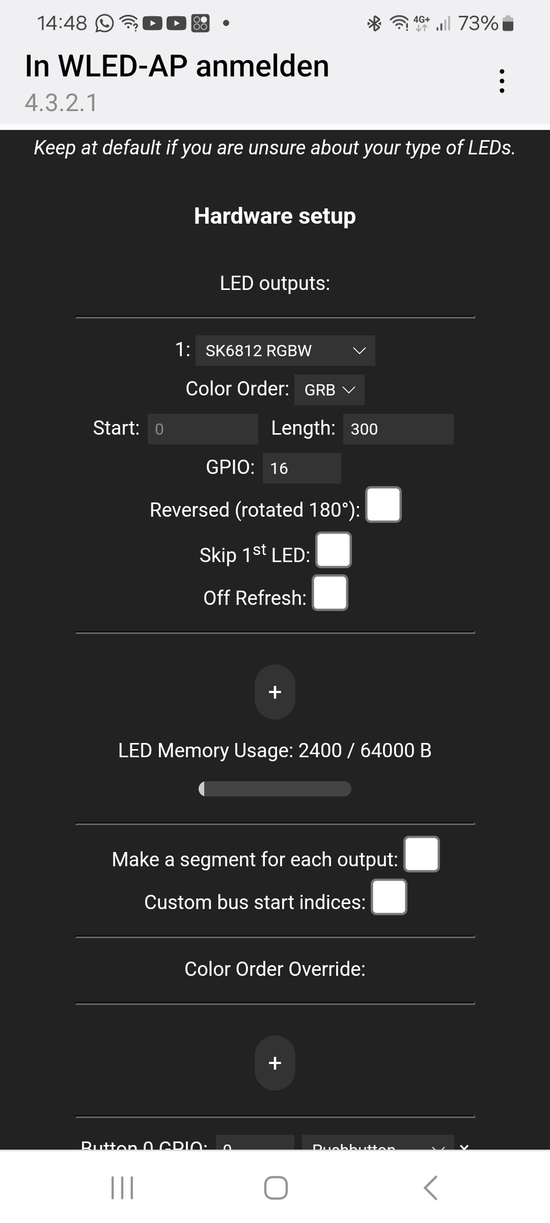 Bevor ich die installierte WLED Version WLED 0.15.0 ESP32 (ESP32-D0WDQ5 build 2412100) downgrade versuche ich es hier mit meiner Frage.