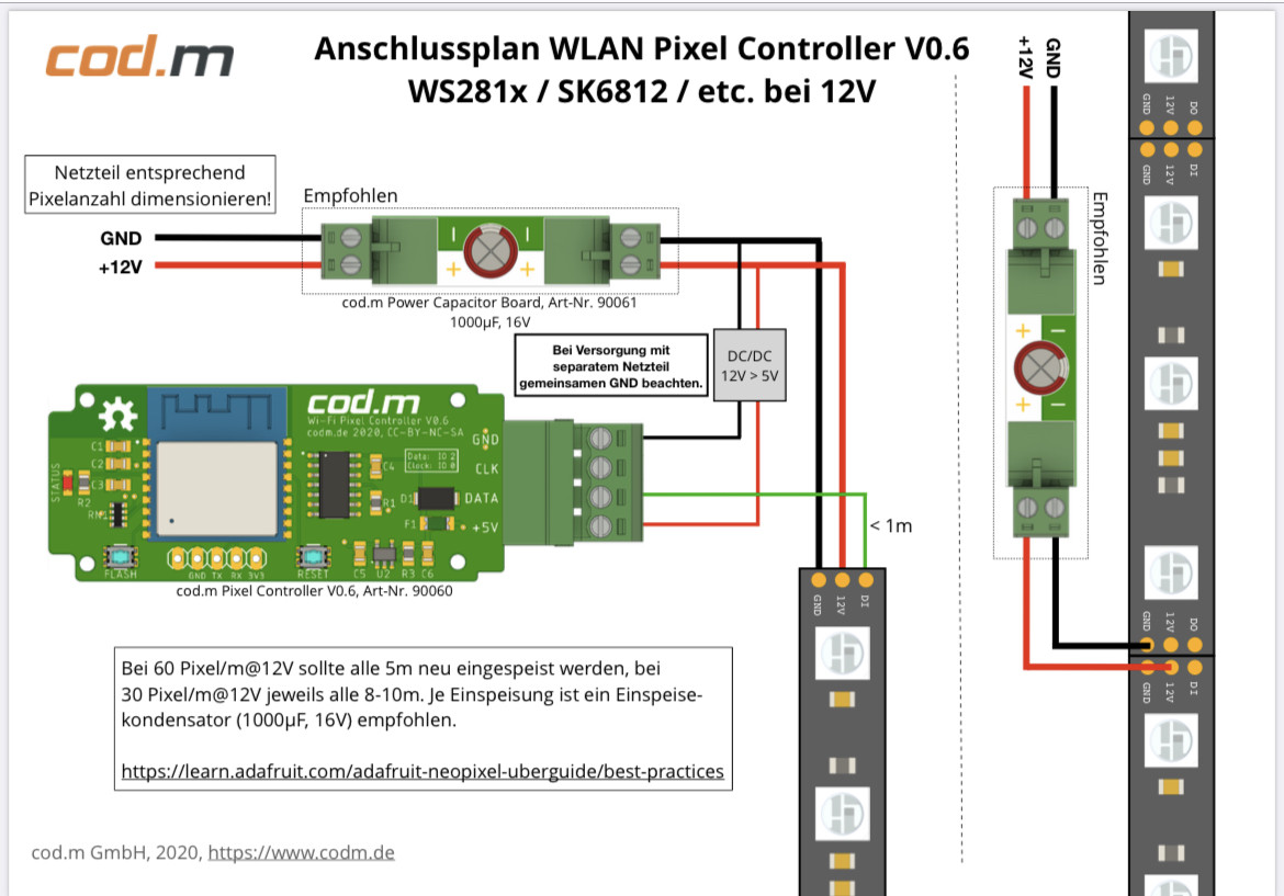 Gast hi, hast Du Dir mal die Anschlusspläne auf der Cod.M Seite für Deinen Stripe Typ angeschaut? Ich habe einen WS2815 der auf 12 v läuft und kann dir diesen hier mal anhängen.