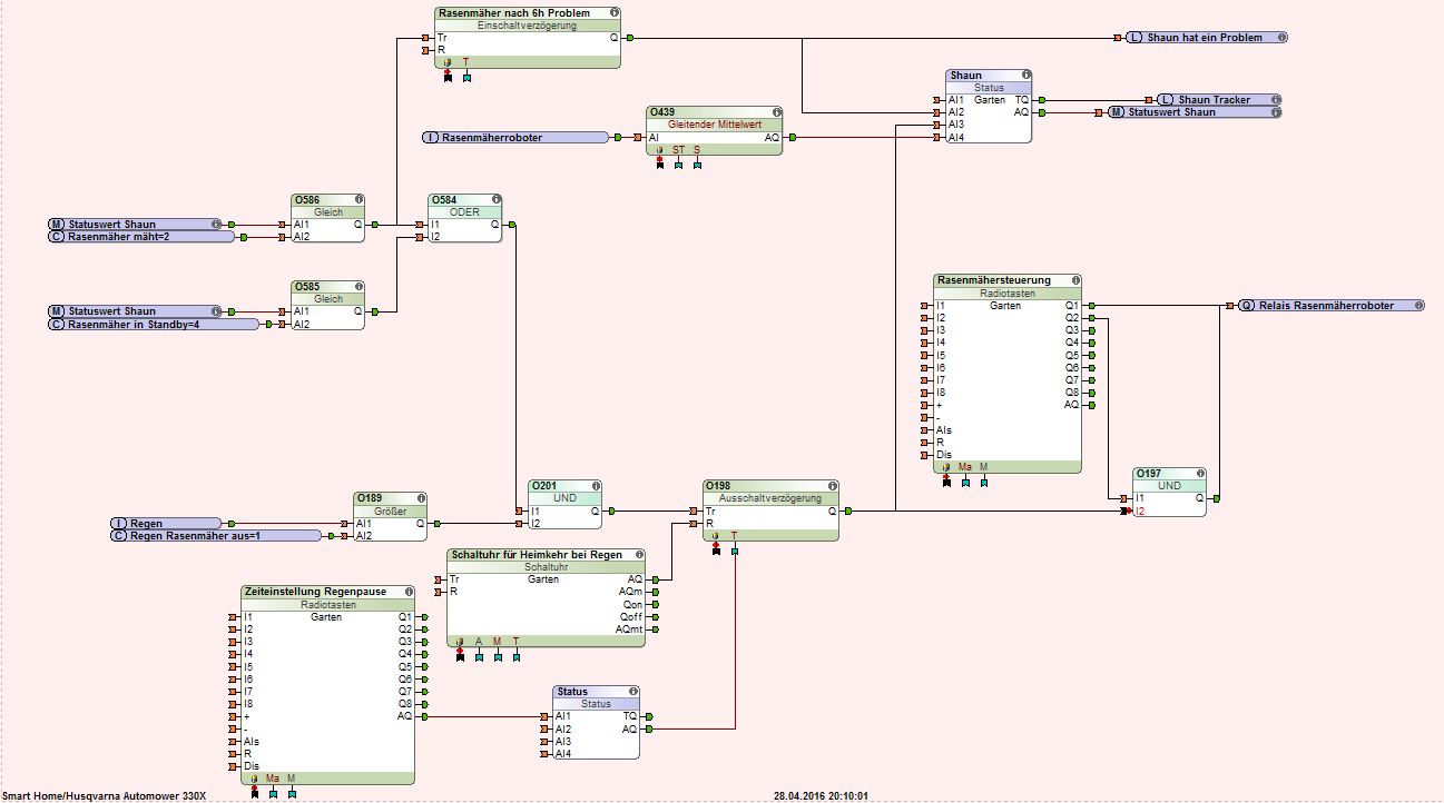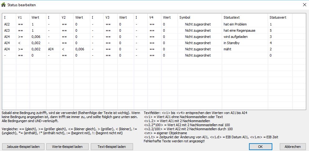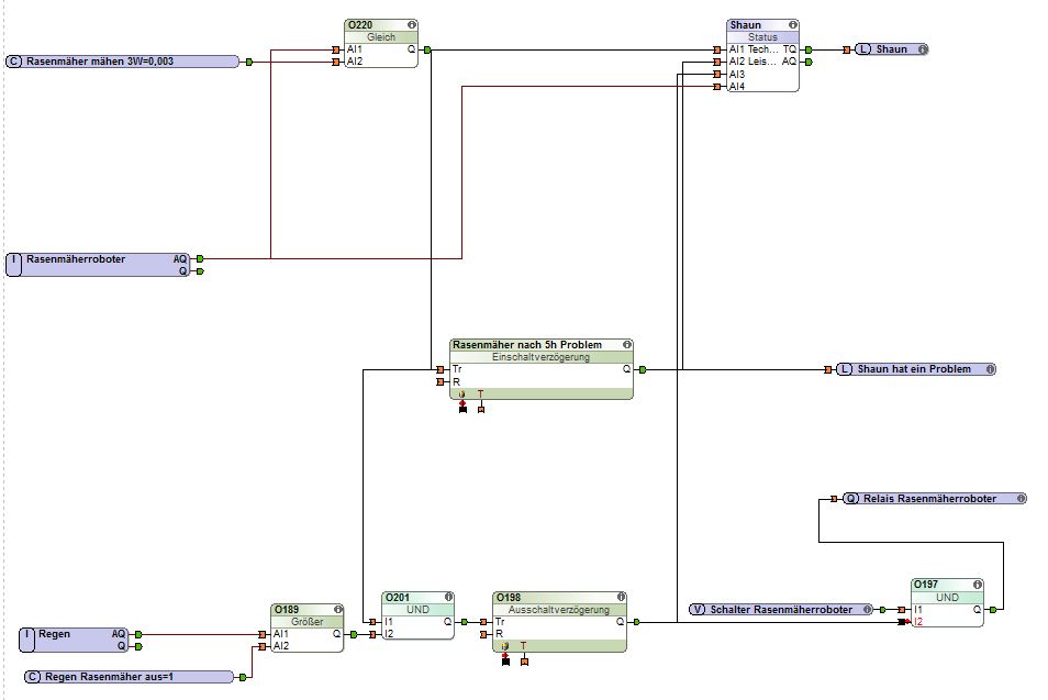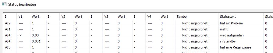 Mit dem Statusbaustein erkenn man was der Rasenmäher macht und kann auch nach 5h eine Störmeldung absenden wenn er noch nicht in der Ladestation angekommen ist.