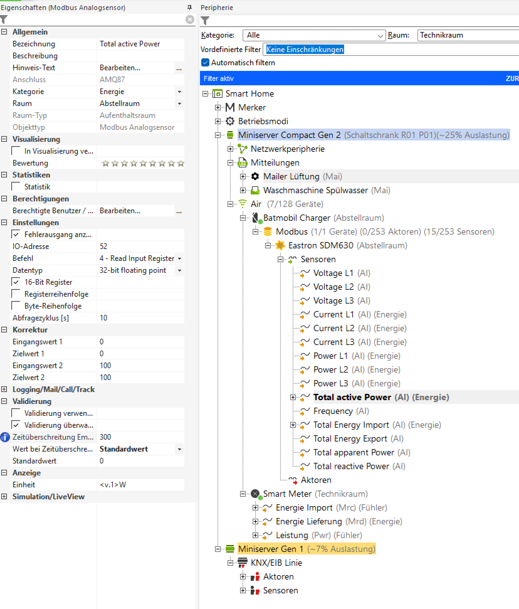Die Einbindung für einen Zähler sollte mit dem nachfolgend dargestellt Screenshot aus Loxone Config ziemlich einfach gehen. Als Einheiten verwende ich i.d.R. kW und kWh.