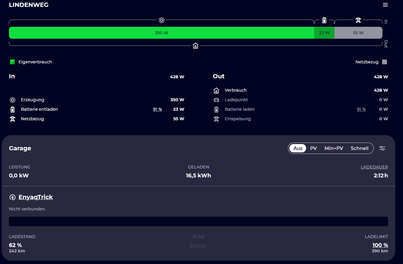 Ziemlich interessant finde ich auch die aktive Steuerung von manchen Batterie-Systemen, leider unterstützt das meine nicht direkt. Indirekt kann man natürlich über gezielte Stromvorgaben einen definierten Zuschuss von der Hausbatterie erreichen, aber das ist natürlich nur indirekt.