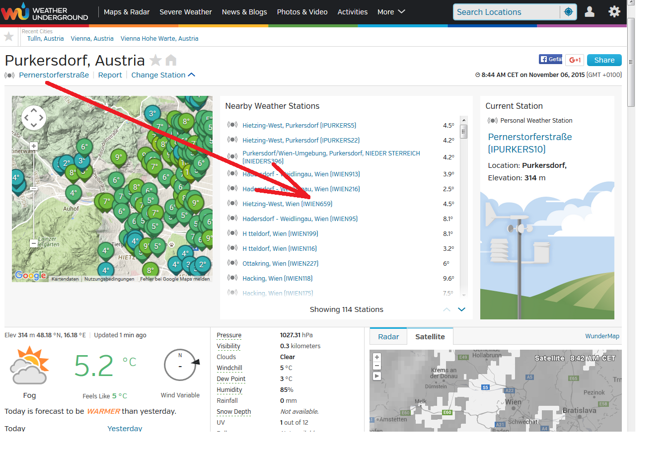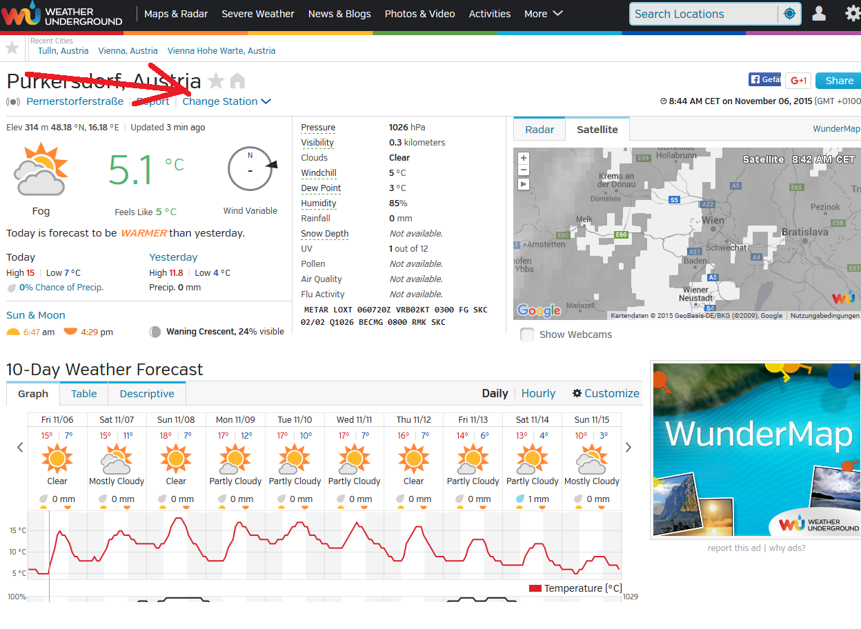 Dabei suche ich mir eine geeignete Wetterstation bei mir in der Nähe, die auf Wunderground registriert ist.