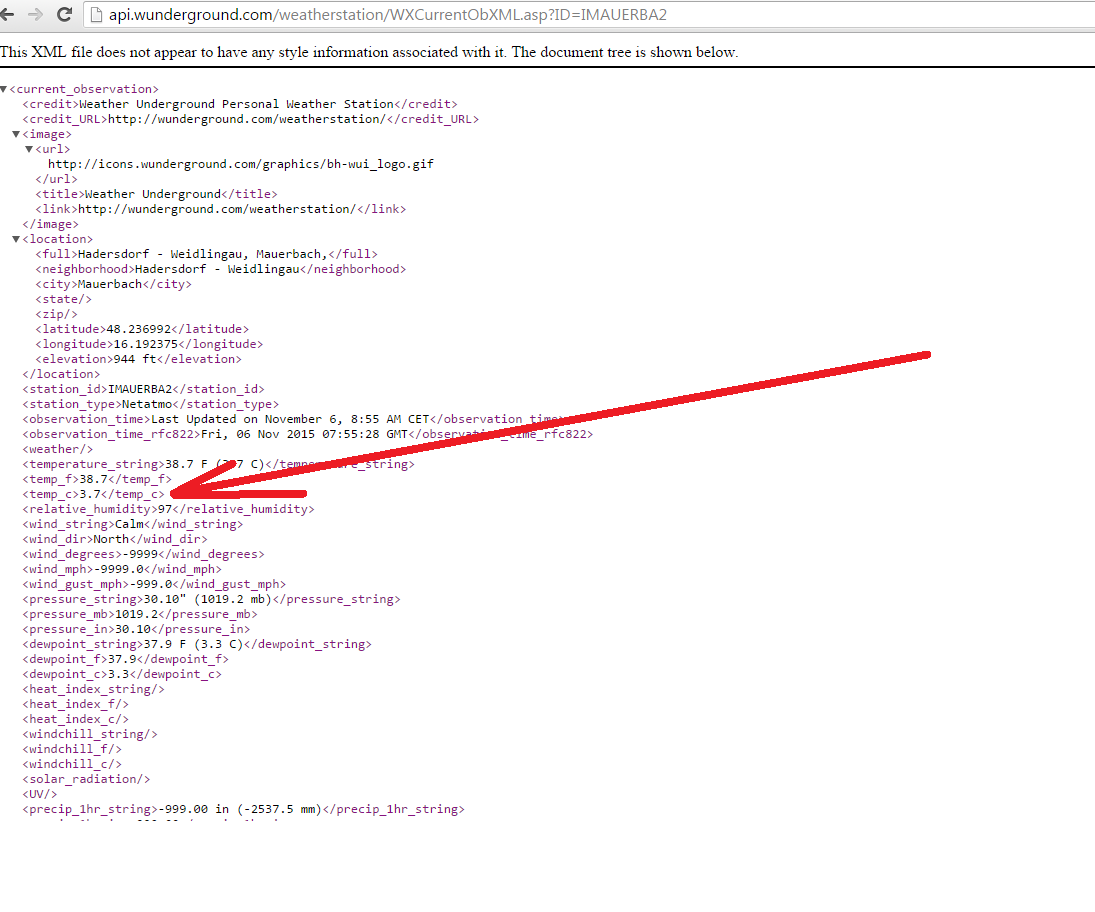 3. Verwende folgende URL um an die XML Daten der jeweiligen Station zu kommen: http://api.wunderground.com/weathers...L.asp?ID=XXXXX