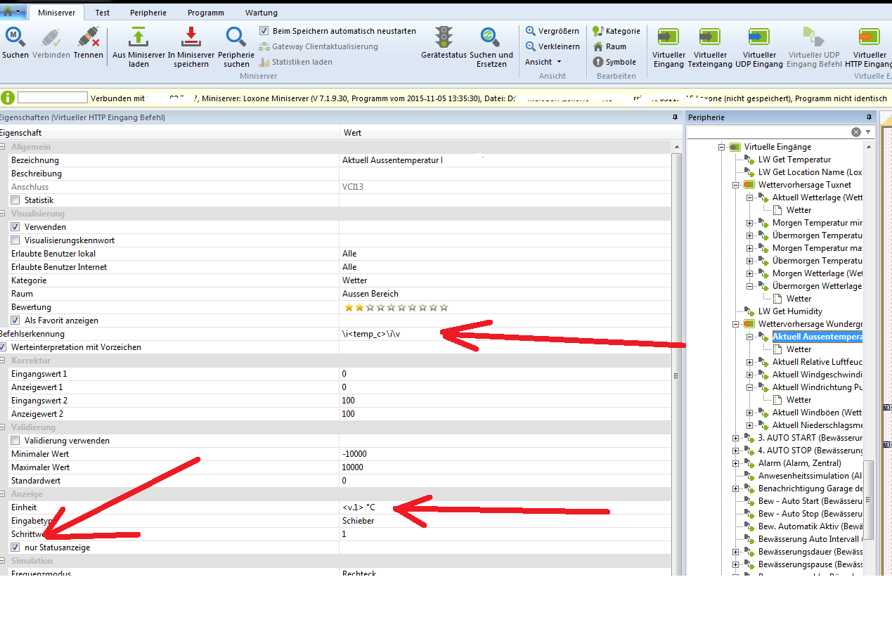 1. Texte (etwa die Windrichtung) über den Virtuellen http Eingang Befehl auswerten zu lassen