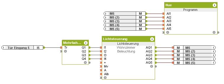 Touch Tree Taster -> I1 - Lichtsteuerungsbaustein (Lampen als Lumitech eingestellt) - AQ1 -> Merker -- Merker -> AI1 - Hue Programmbaustein (Input Einstellung 6 und Lampengruppe definiert)