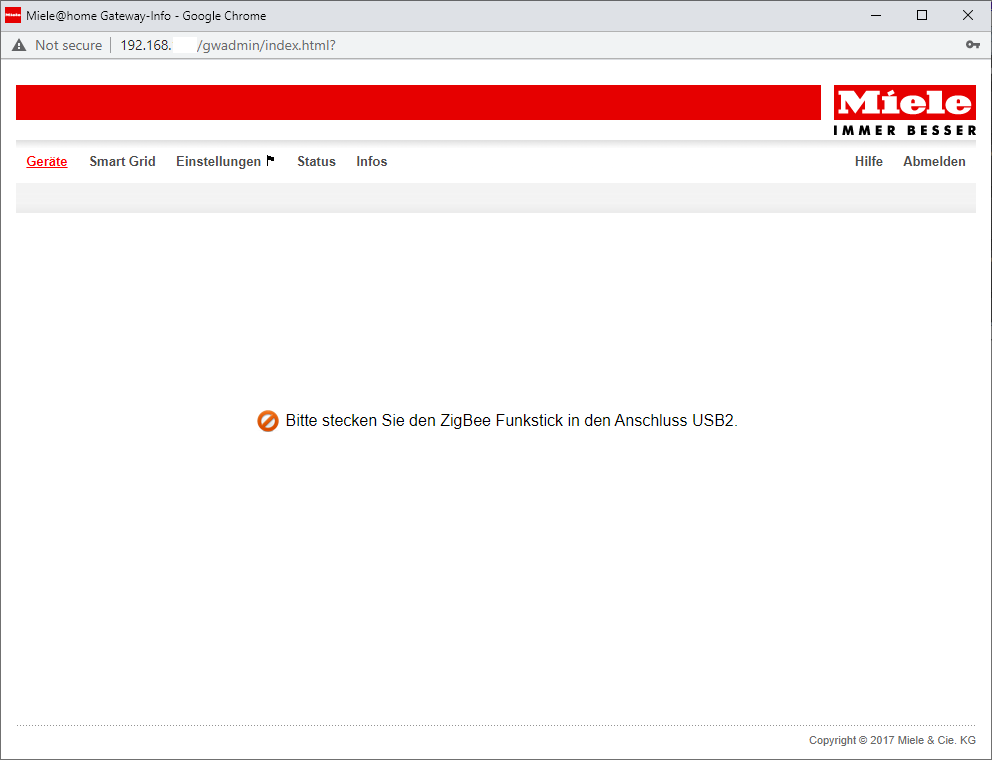 Beachte: lass das Gateway mind. 2 Minuten laufen und achte auf die Status-LED. Schalte dann ein Miele Gerät an. Dann nehme nach zwei weitern Minuten (so viel ich weiss ist dies das Abrageintervall) eine Browser wie Firefox oder Chrome zur Hand (nicht Safari!) und gebe folgendes ein: