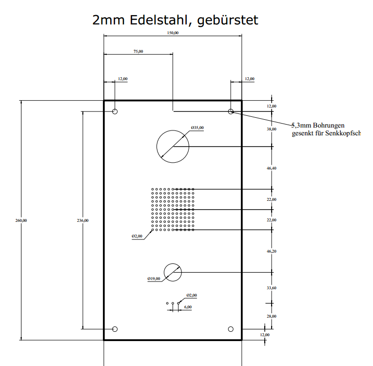 • Ich habe mir in einem kostenlosen CAD Programm (Turbo CAD) eine Platte in 2 mm Edelstahl konstruiert, die auf die UP Dose passt und diese in einer Schlosserei lasern lassen Z. B. bei ProKilo.de für ca. 50,-€. So sieht die Zeichnung aus. Hat logischerweise eine Ähnlichkeit zur Loxone Intercom. Alleine schon wegen den Maßen der Up Dose. Sprechsieb, Taster-Bohrungen, Mic-Löcher, nicht vorhandenes Namensschild und Material weichen aber ab. Soll jeder so machen wie er es möchte. Ich finde Anlagen wo alle Elemente mittig zentriert sind (Loxone, Baudisch,...) sehr schön und übersichtlich.