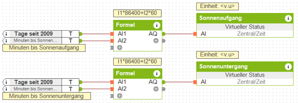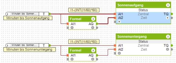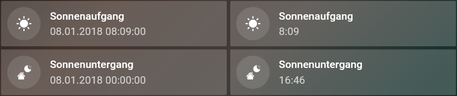 Hintergrund ist, ich fahre die Jalousien mit den Impulsen Sonnenaufgang und Abenddämmerung, weiß aber nie genau, wann das ist, da ich die Zeit nicht in der App darstellen kann. Hätte da gern zwei Werte angezeigt, einmal rauf und einmal runter.