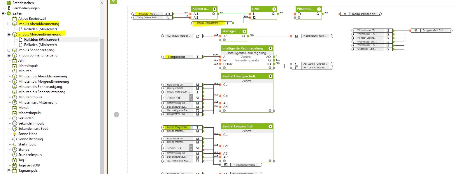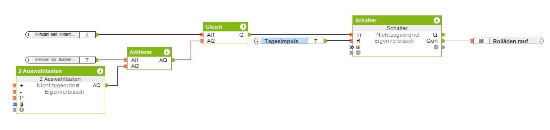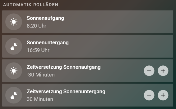 Bei mir gehen die Rolläden abends mit Impuls Sonnenuntergang runter. Ich habe mir das schon so umgewurschtelt, dass ich dies im 5 Minuten Takt nach hinten schieben kann.