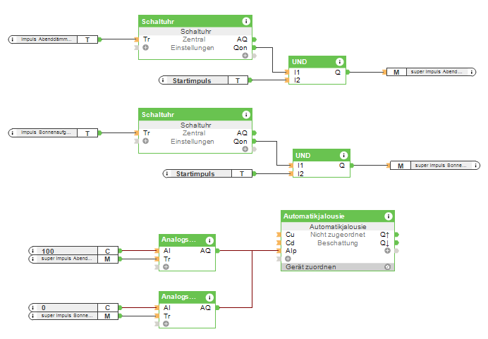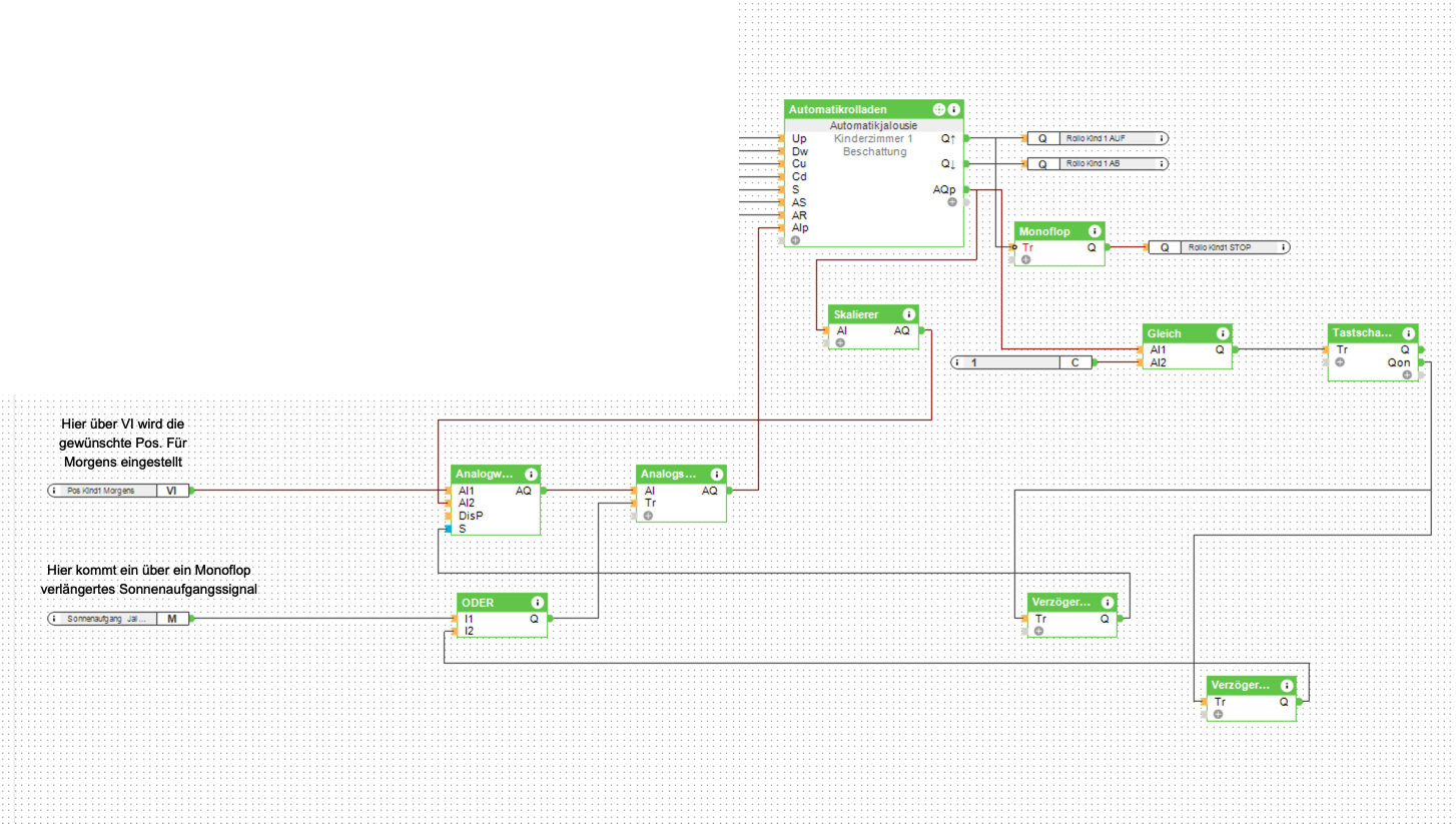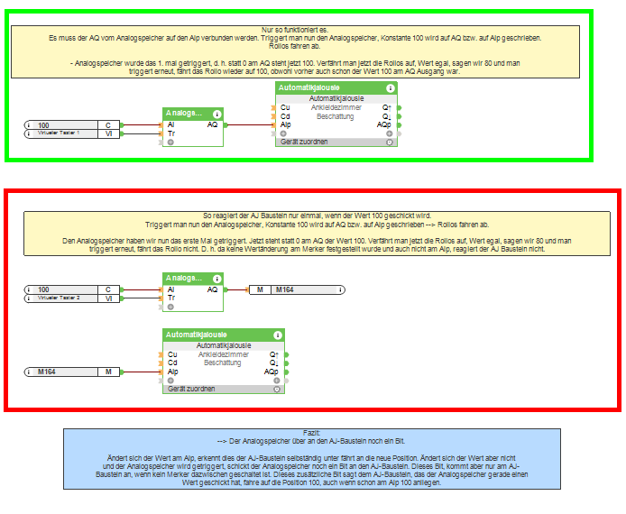 ich habe ein Verständnisproblem. Ich habe zuerst die untere Programmierung verwendet. Also mehrere verschiedene Positionswerte definiert. Über einen Impuls schreibe ich die gewünschte Position auf einen Merker. Der Merker hängt wiederum am Alp Eingang der Automatikjalousie.