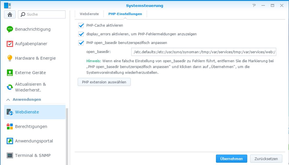 also.... Was die Synology User angeht ist das Probleme in den PHP Einstellungen zu finden. Ihr müsst in den "open_basedir" Einstellungen euren Pfad (falls er nicht vorhanden ist) hinzufügen.