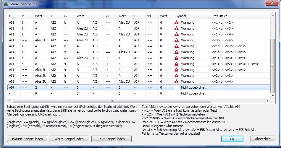 Im meinem Beispiel habe ich alle Fenster in zwei Statusbausteine aggregiert. Alarm Warnung abwesend wenn das Haus verlassen wird und Fenster Warnung für Alarmanlage anwesend (Haushüllenüberwachung) fix um 22:00h falls noch irgendein Fenster offen ist.