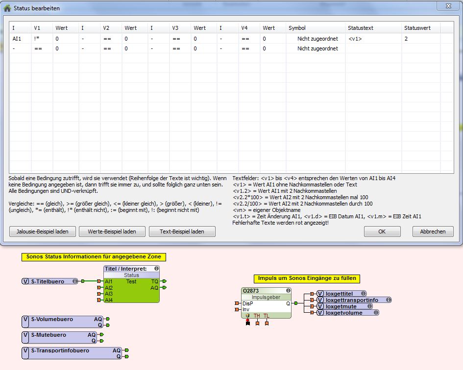 anbei Lösung für Info in Loxone. Der 'virtuelle Texteingangsverbinder' liefert die Info bzgl. Titel/Interpret und in Verbindung mit einem Statusbaustein kann die Info visualisiert werden.