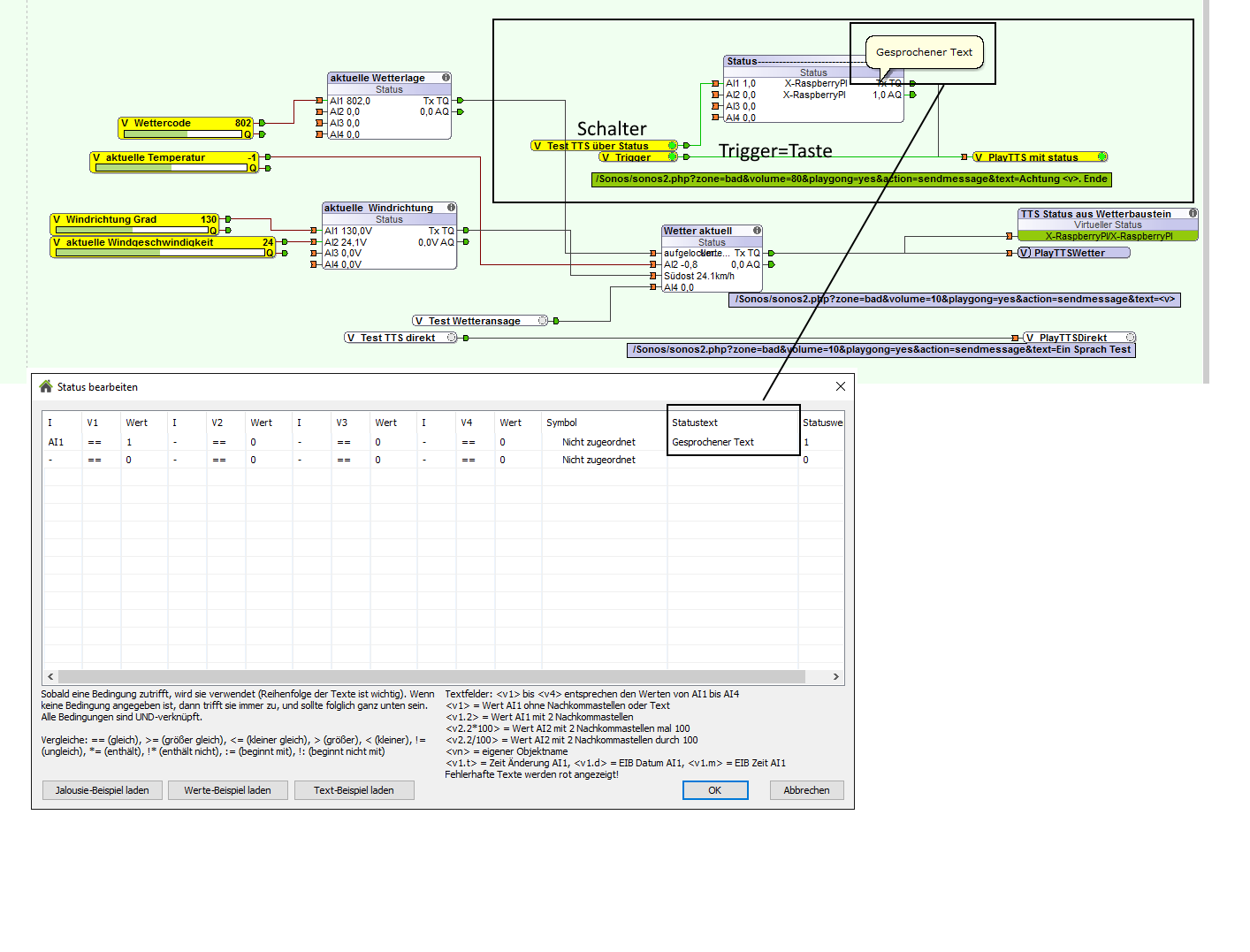Im Statusbaustein habe ich mir dann (zu Testzwecken) einen Text definiert, der am Ausgang Tx ansteht, wenn ich A1 auf "1" stelle. Den möchte ich nun per TTS ausgeben, wenn ich einen Trigger auslöse. So habe ich es in den Beiträgen auf Seite 5 in diesem Thread gesehen.