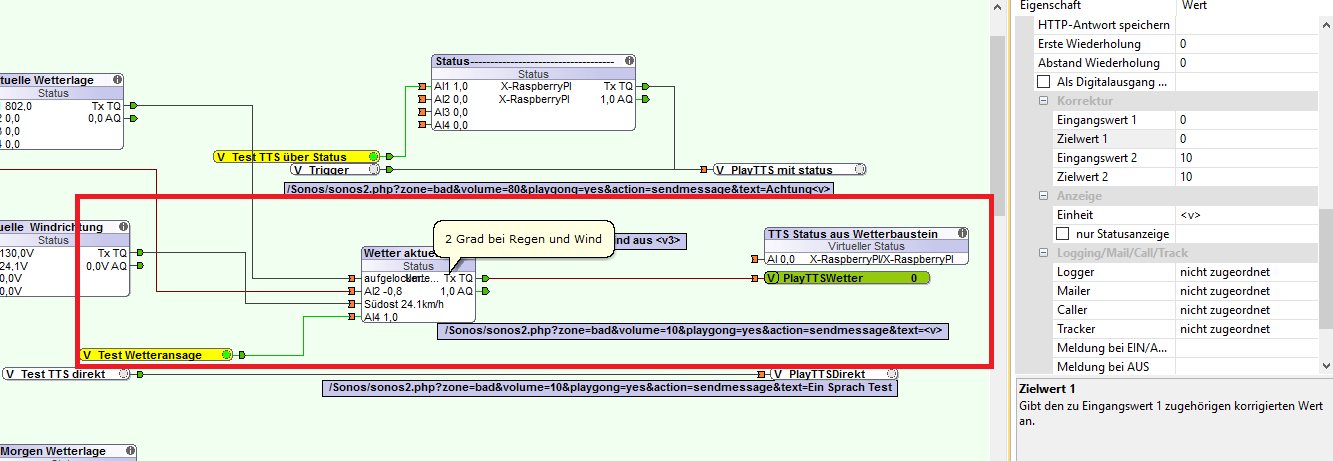 Danke euch beiden. Ich habe alles noch mal gecheckt und nur den Statusbaustein ohne Trigger verwendet. Es bleibt aber dabei. In der Ansage kommt immer nur "Das Wetter heute wird NULL". Zwischenzeitlich habe ich kurioser Weise mal den Anfang des gewünschtes Satzes "Das Wetter heute wird 2 Grad bei..." gehört, der aber mittendrin abgebrochen ist. Das wars. Nun kommt immer die gesprochene 0 an der Stelle des Parameters. Ohne was zu ändern zwischenzeitlich!