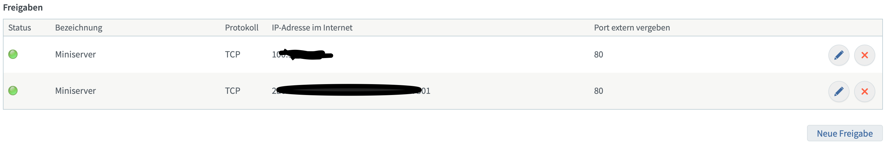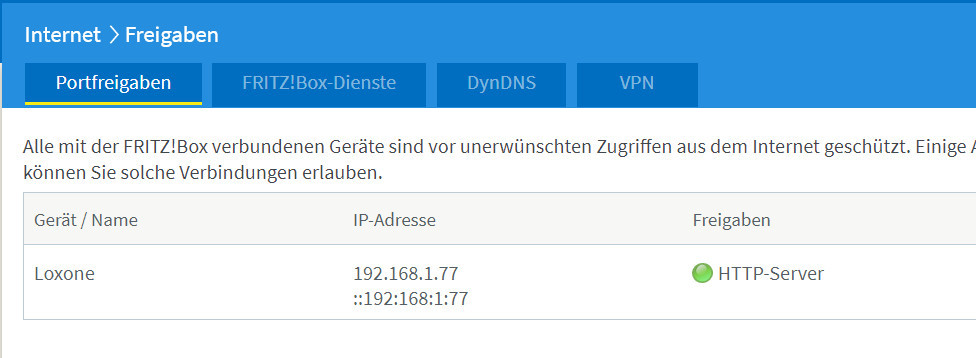 Dazu noch eine weitere Frage zur Fritzbox. Ich habe ja das Model 7490 und es scheint hier ein Softwareupdate gegeben zu haben. Wenn ich eine fixe IP Adresse für Loxone vergebe und dann die Portreigabe mache, dann bekomme ich zusätzlich zur IPv4 auch eine IPv6 Adresse (selbe IP Nummern) und folgenden Screenshot: