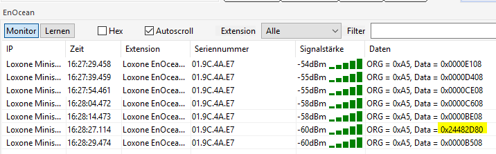 Der gelb markierte Wert ist das Learnbit, das gesendet wird, nachdem ich die LRN Taste Amt sensor drücke.