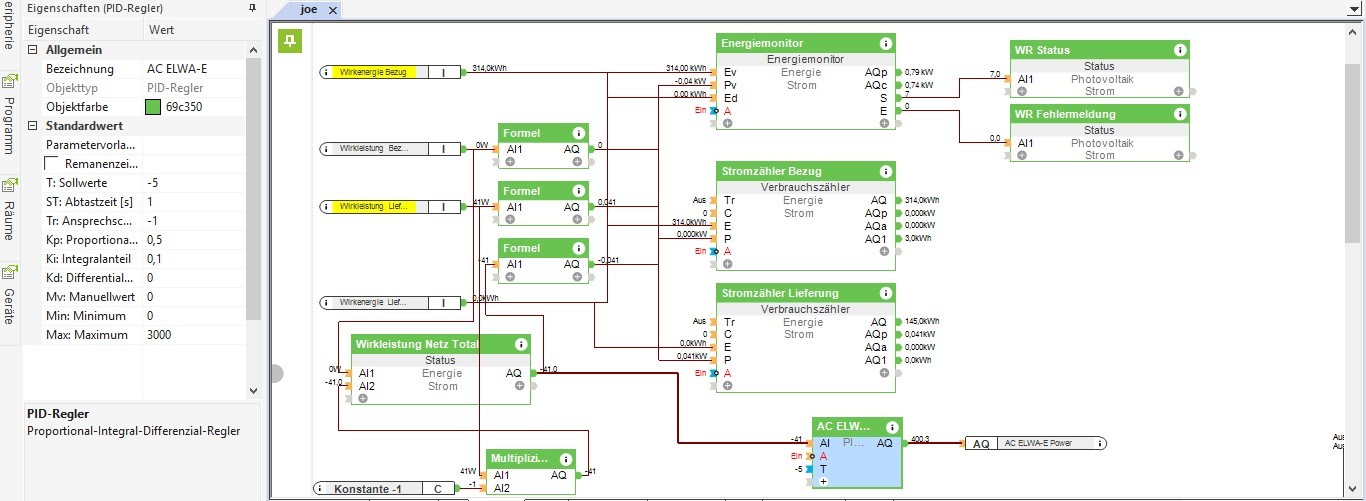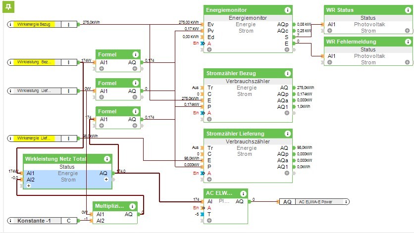Hatte es schon probiert mit der direkten Anbindung der Wirkleistung Lieferung an den AC ELWA-E, da habe ich aber dann das Problem, dass die Wirkleistung Lieferung sobald der Heizstab zu heizen beginnt, natürlich langsam auf 0 geht und dann nimmt sich der Heizstab die volle, von der PV-Anlage produzierte Leistung und der normale Hausverbrauch ist nicht mehr gedeckt.