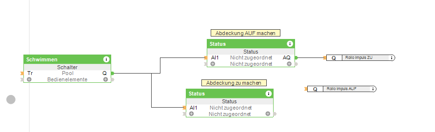 genau das ist ja mein Problem - ich probiere es mit dem Baustein Status und habe dort konfiguriert AI1 == 1, Statuswert=1 - so wenn ich jetzt 1 rein sende dann sendet er auch 1 aber wenn ich vorne 0 rein sende dann sendet er trotzdem 0 weiter …. auch habe ich dann A1 != 1, Statuswert= > Also leer gelassen .. aber auch das funktioniert nicht .