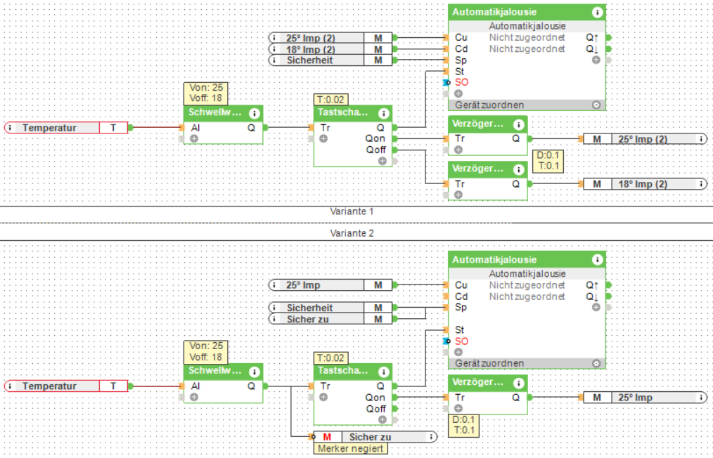 Wie aber kann ich dem Raumklimasensor Air beibringen dass er bei 25°C die Fenster öffnen soll, und weiters bei 18° ´C die Fenster wieder schließen? Also als Sicherheit Wind und Regen über die Wetterstation, und gegen Frost der Raumklimasensor.
