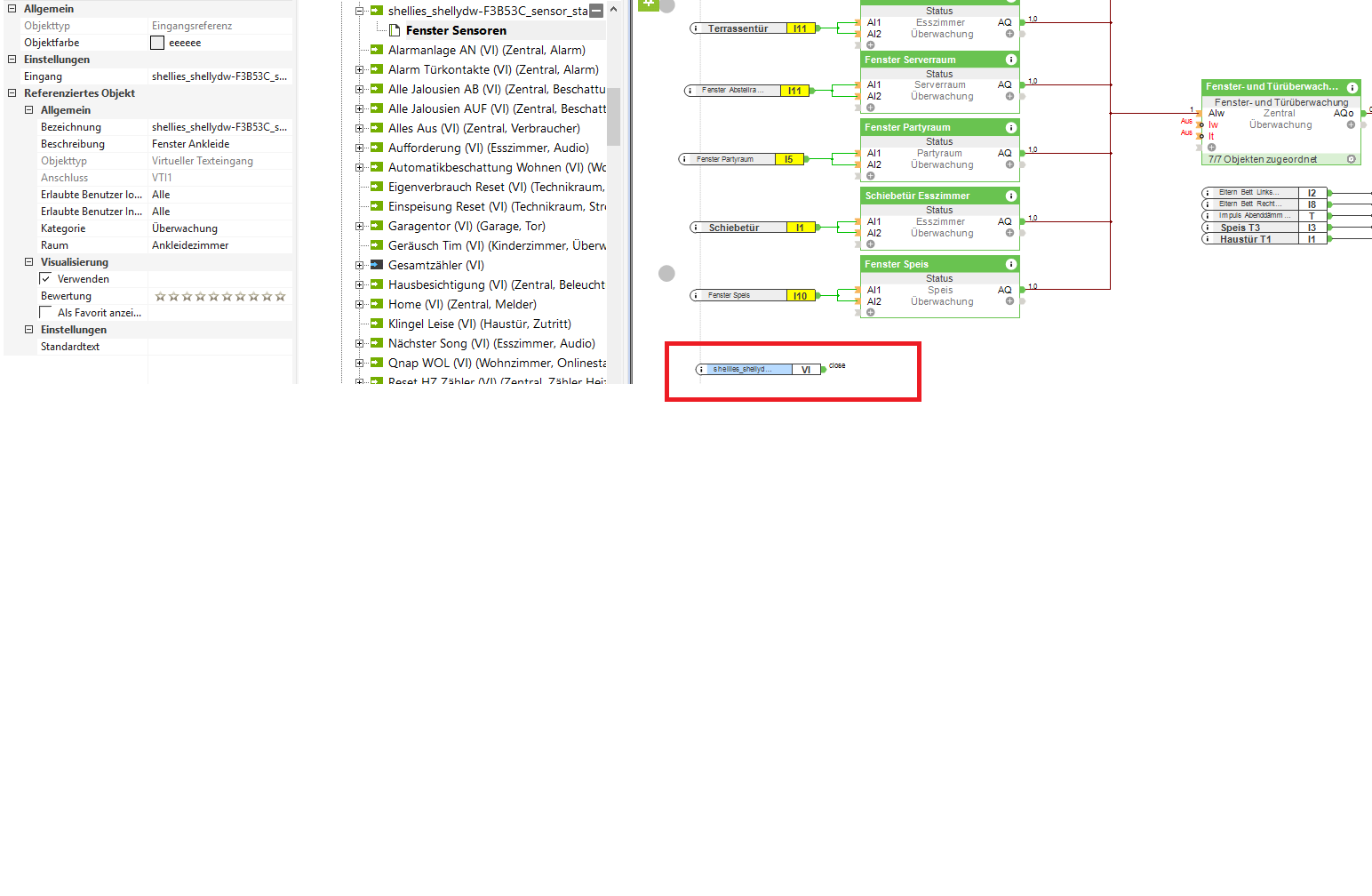 Ich verwende ihn nun mit einem Virtuellen TEXTAUSGANG da dieser entweder CLOSE oder OPEN anzeigt. Nun möchte ich ihn gerne in meine Zentrale Fenster und Türüberwachung einbinden.