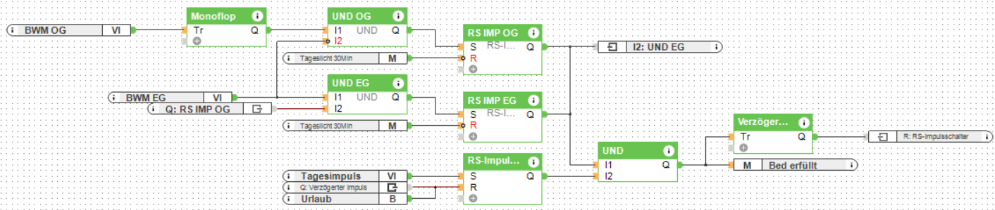 Danke, Romildo. Guter Grundgedanke, funktioniert so aber leider nicht. Die Bedingungen müssten so ja gleichzeitig erfüllt werden. Habe Deinen Gedanken mal aufgegriffen und es jetzt so gemacht (vereinfachte Fassung). Das funktioniert im Prinzip. Allerdings hat die Sache einen Haken. Wenn der EG-BWM noch aktiv ist und ich nähere mich dem OG-BWM wird auch ausgelöst. Ziel ist aber, dass nur in Laufrichtung OG->EG aktiviert wird. Ich denke aber, dass lässt sich über eine Verzögerung regeln.
