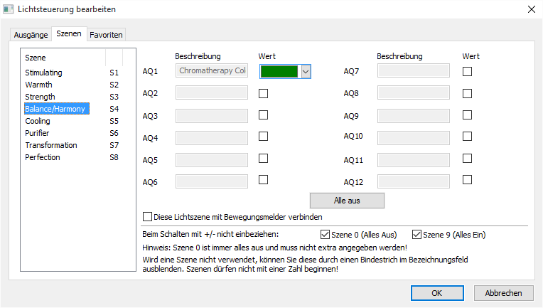 Selbst wenn der Bewegungsmelder nicht mehr belegt ist (Raum verlassen) und der AQ3 wieder über Taster I3 abgeschalten wurde bleibt die Szene 1 AQ1 erhalten.