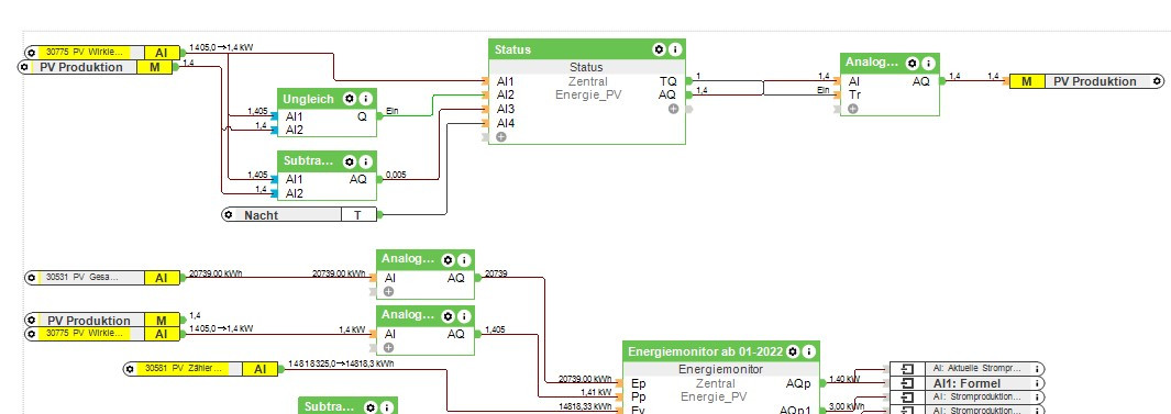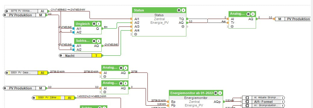 Sag mal noch ne andere Frage... ich habe ja bei fast allen Registern ausser bei Bezug den Baustein "Analog Min Max Begrenzer" dazwischen gesetzt und dort entsprechende Grenzen gesetzt z.B. 0 bis 10.000 bei Eingang PP Wirkleistung Produktion...
