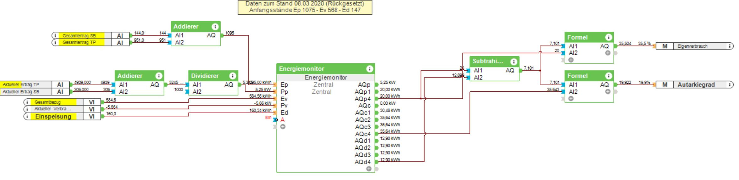 Die Eingangswerte sind korrekt: Vom WR per MODBUS, vom Stromzähler per IR-Schnisstelle. Wobeo der Momentanverbrauch nur alle 3 Minausgelsen werden. Der Momentanverbrauch wird in Loxone aber angeblich ja auch NUR für die visuelle Darstellung genutzt, und nicht für die Zähler ...