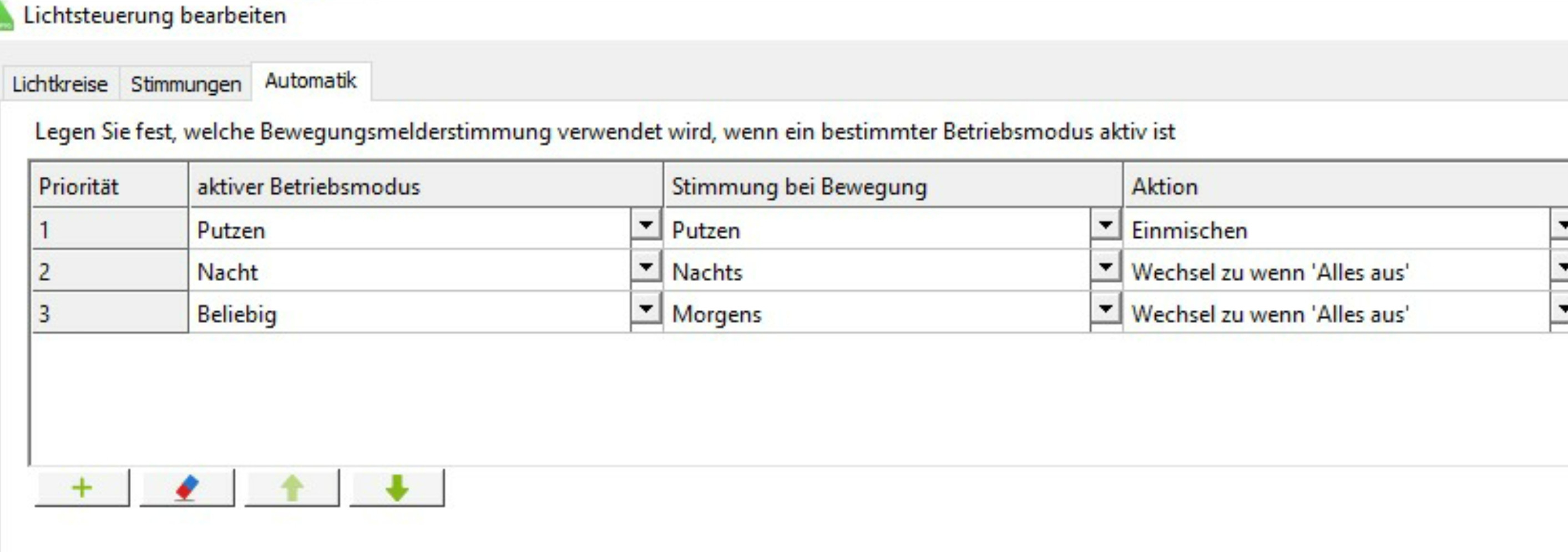 Die Betriebsmodi aus der Automatik Spalte von dem Lichtbaustein werden alle je nach aktiv. Betriebsmodus geschaltet.