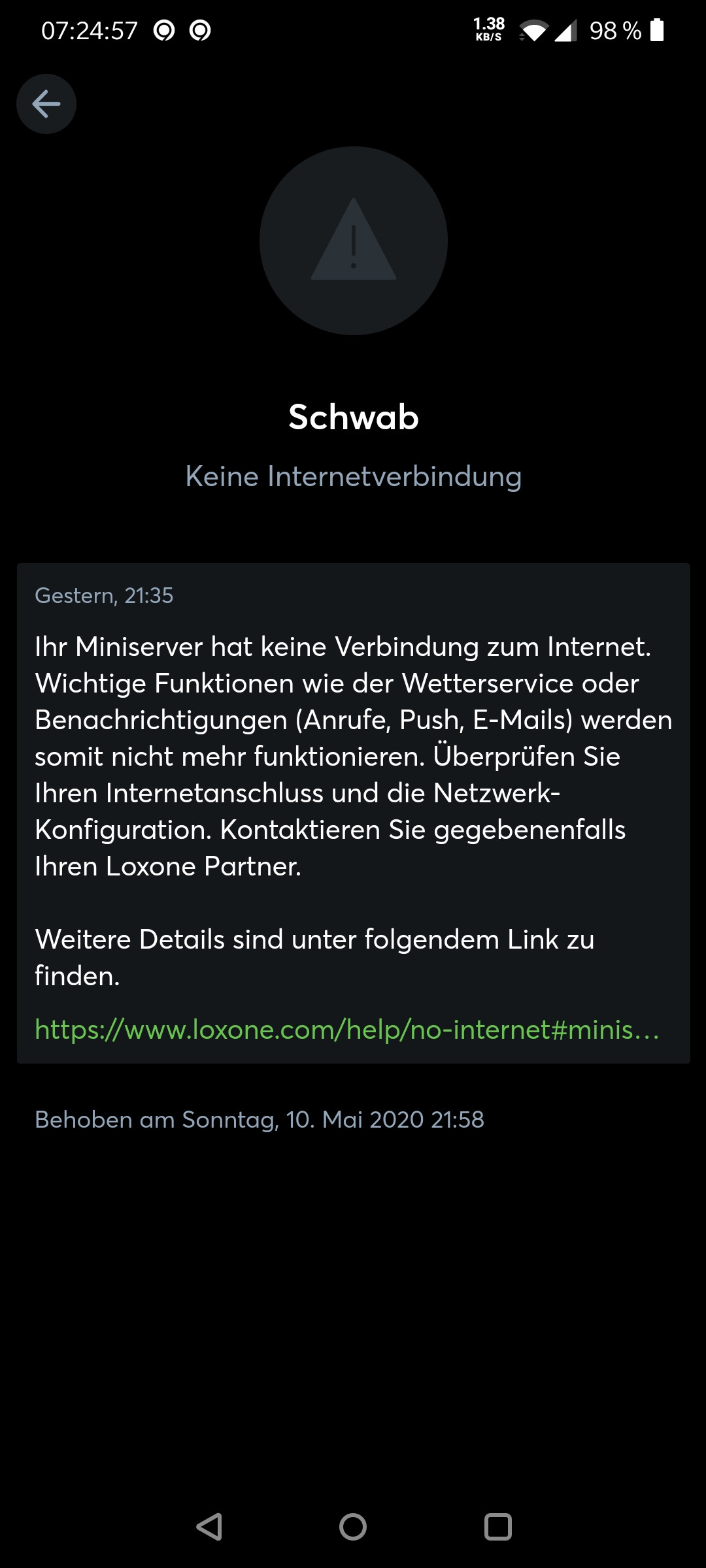 Ich habe das Problem, dass ich ca. alle 2 Stunden die Meldung "Keine Internetverbindung" erhalte. Der Miniserver ist aber grundsätzlich über das Internet erreichbar, nur offensichtlich verliert er ca. alle 2 Stunden die Verbindung. Das Problem dabei ist, dass wir letztens einen Fehlalarm des Brandmelders hatten und die Push-Benachrichtigung nicht rausging, weil genau zu der Zeit keine Internetverbindung vorhanden war