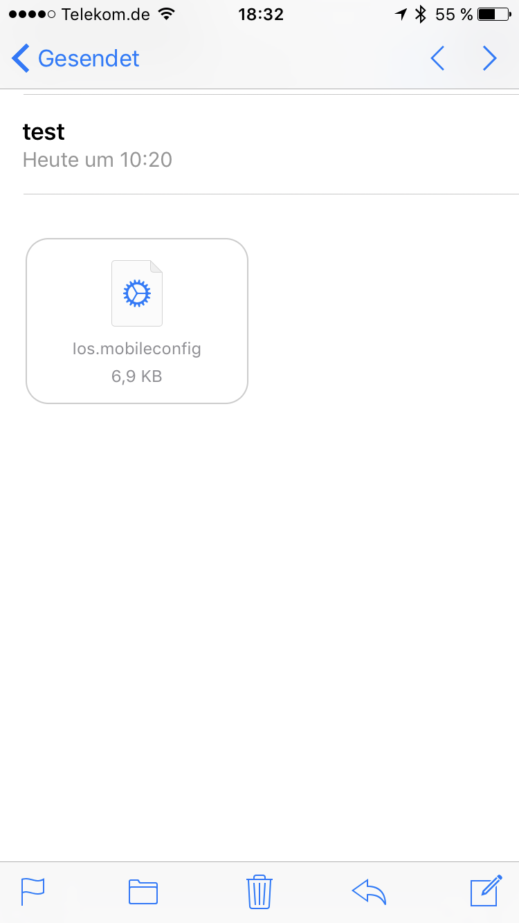ich habe es mit meinem iPhone v10.2.1 gerade noch einmal getestet: die .mobileconfig Datei wird genau so angezeigt, wie bei Dir, wenn ich eine E-Mail mit so einen Anhang per Mail App öffne. Tippe ich auf diesen Anhang, dann wird direkt auf die Anzeige "Profil" gewechselt, wo ich mir mit "Details" den Inhalt des Profils noch einmal ansehen kann und mit "Installieren" das Profil auf dem iPhone installiere. Keine Ahnung, warum es bei Dir nicht funktioniert.