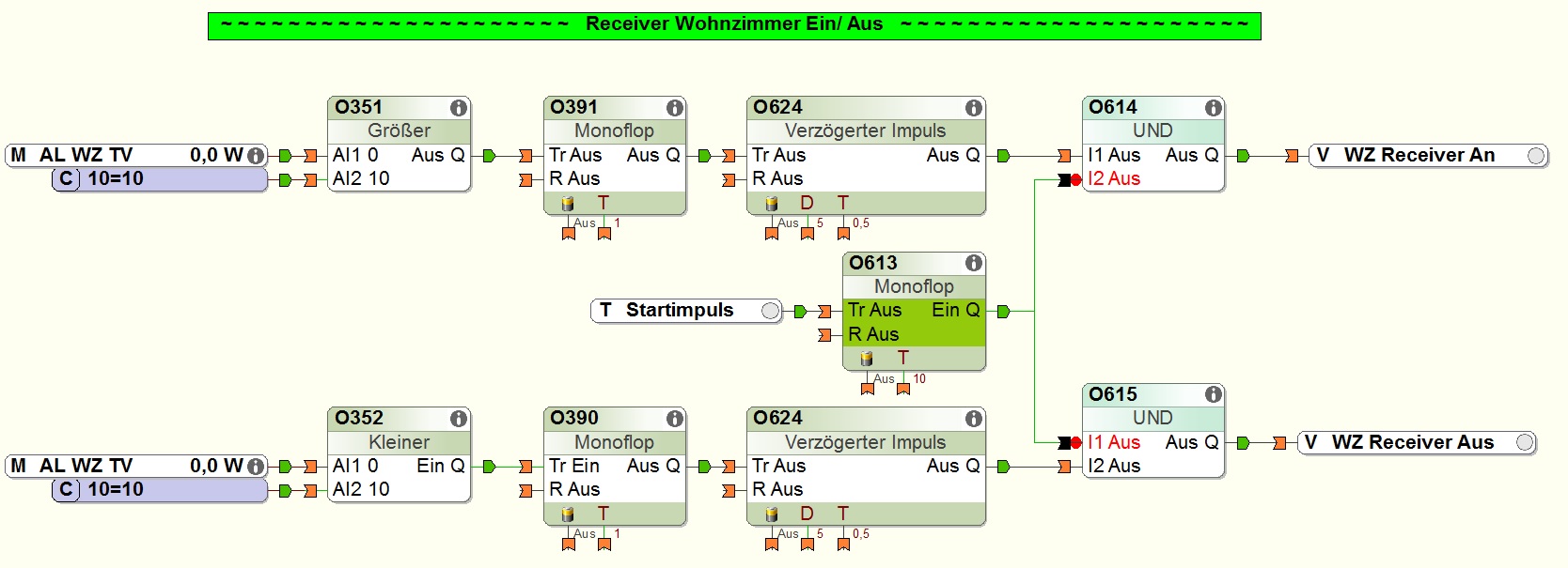 Besten Dank für den Tipp! Schalte den Receiver in Abhängigkeit des Fernsehers über http-Befehle, weil es über die Harmony immer Probleme gab. Immer bei Neustart war einmal kurz der Fernseher schwarz. Jetzt mit dem Startimpuls klappt alles. Musste allerdings zusätzlich einen Verzögerten Impuls einbauen, da der "böse" Impuls wohl vor dem Startimpuls kam. Egal, jetzt funktioniert alles!