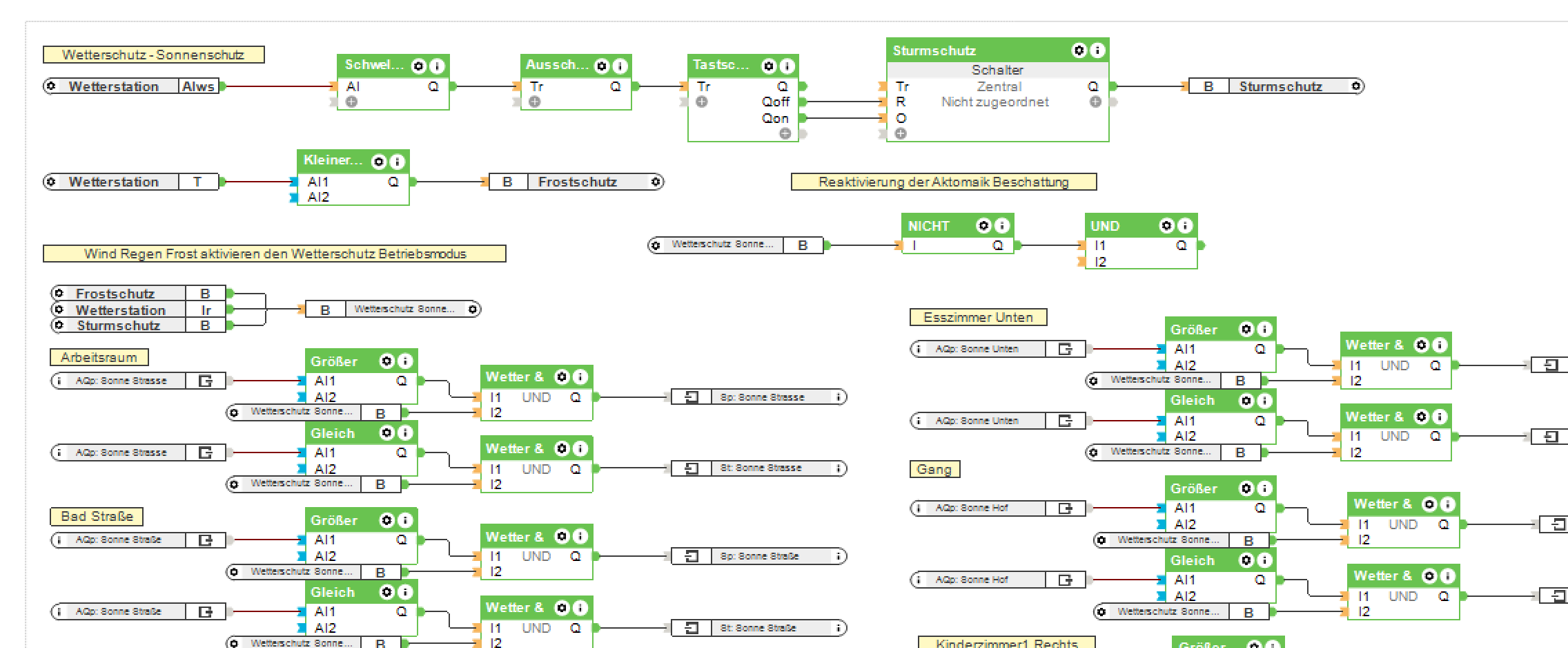 Danach würde ich gerne die Automatikbeschattug wieder aktivieren. Funktioniert aber leider nicht. Vorläufig mal einen VI Eingang auf den Zentralen Baustein Sonnenschutz gesetzt.